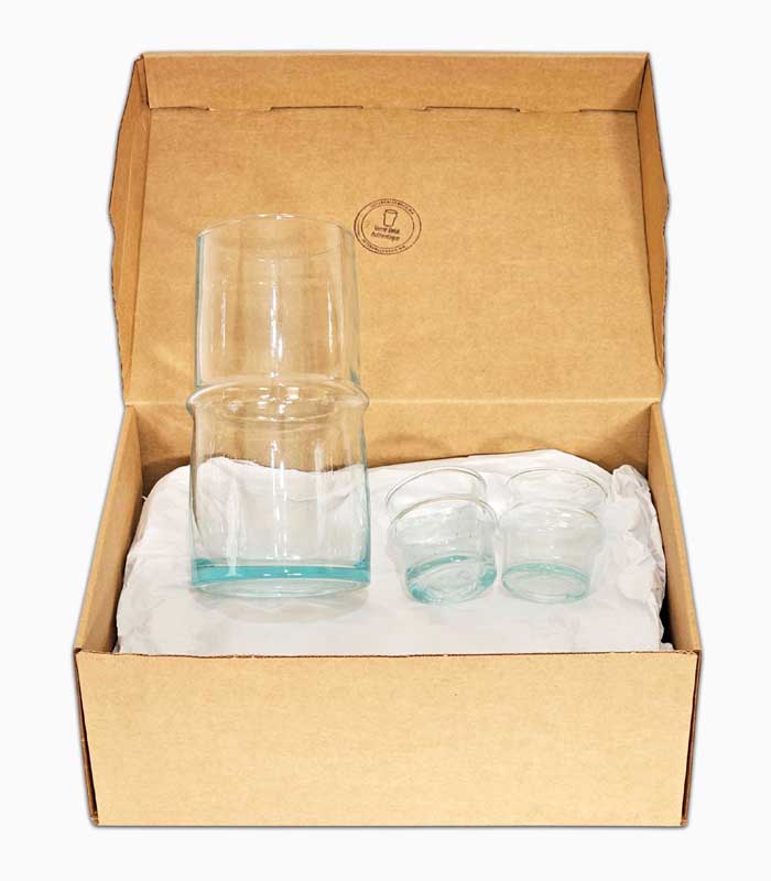 Ce coffret cadeau artisanal met à l’honneur le verre soufflé marocain, apprécié pour sa transparence, ses formes simples et son caractère authentique. Chaque pièce est façonnée manuellement, ce qui explique les légères variations visibles d’un article à l’autre. Ces nuances font partie intégrante du travail artisanal et donnent à chaque coffret son caractère unique.