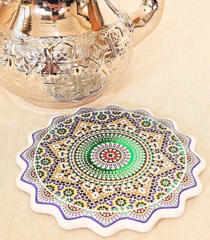 - Deux sous-verres en céramique – chaque motif s’inspire des zelliges marocains typiques des médinas.