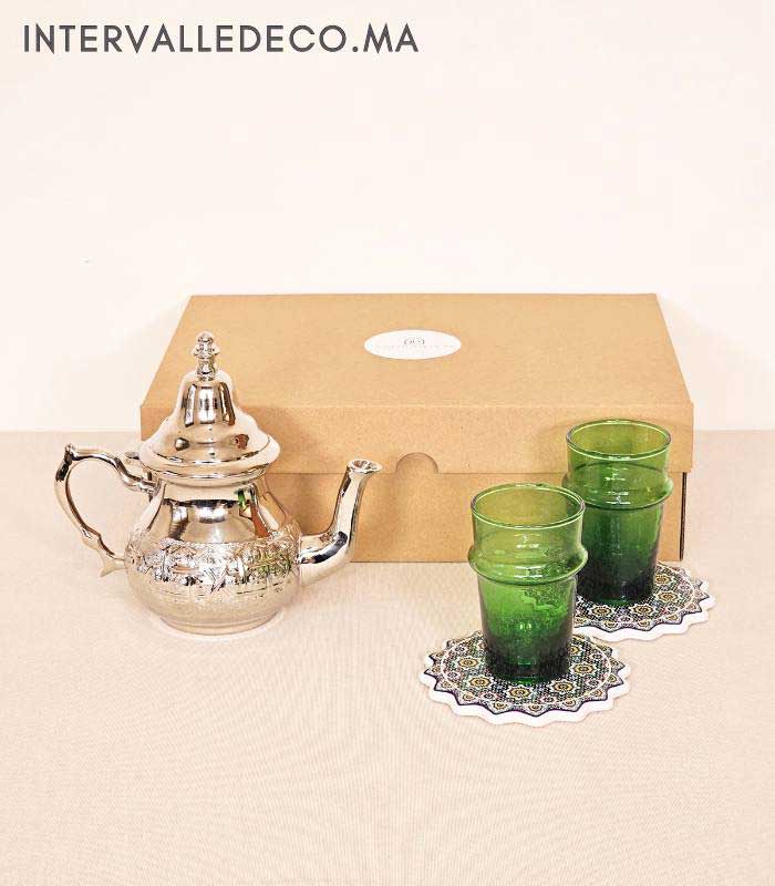Coffret cadeau marocain traditionnel – Théière, verres beldi verts et sous-verres artisanaux