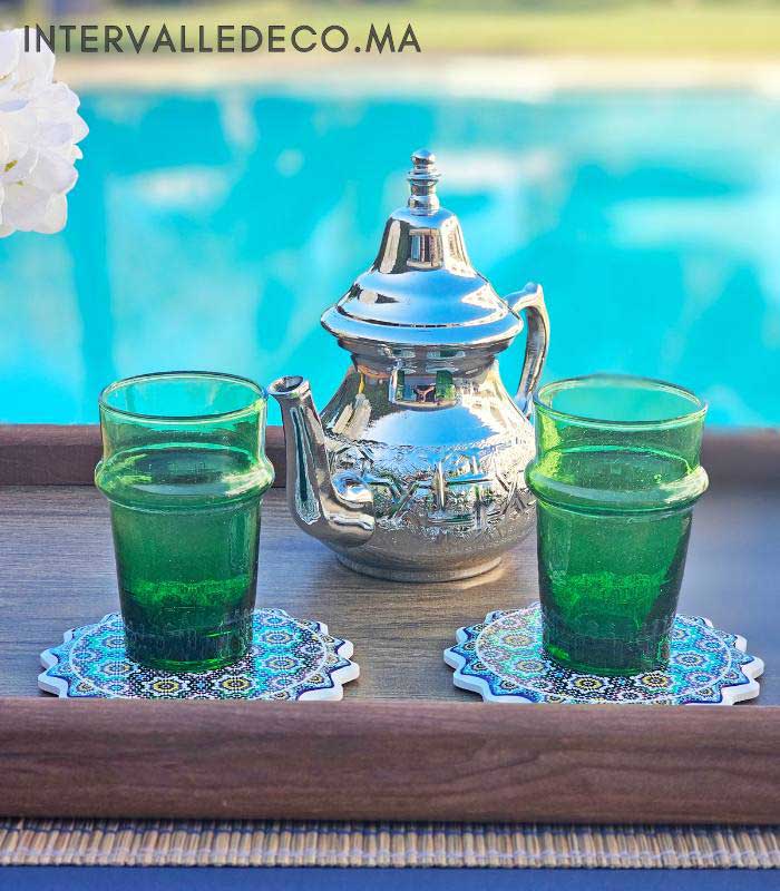 - Contenu : 1 théière traditionnelle + 2 verres beldi verts + 2 sous-verres