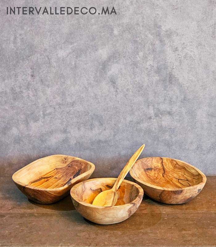 Chaque élément est fabriqué à partir d’un seul morceau de bois d’olivier marocain. Cette méthode de fabrication assure une bonne résistance dans le temps et limite les risques de fissures. Le bois d’olivier est naturellement dense et dur, ce qui le rend adapté à un usage régulier.