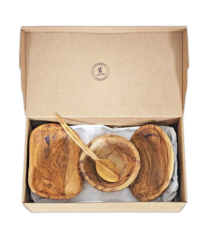 Coffret cadeau vaisselle en bois d’olivier – Pièces artisanales uniques