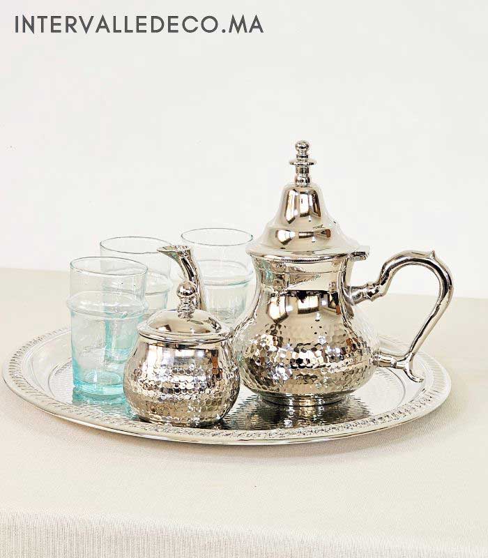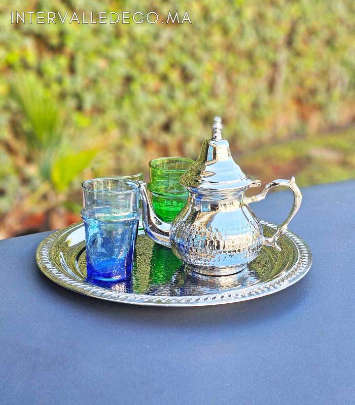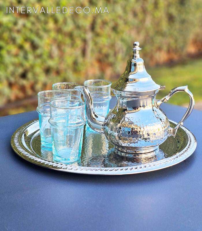 Idéale pour le thé à la menthe marocain, cette théière convient également pour servir des infusions ou des tisanes. Grâce à son style raffiné, elle peut aussi devenir un élément décoratif sur une table, un buffet ou une vitrine. Placée sur un plateau martelé avec des verres assortis, elle attire immédiatement le regard et valorise la tradition marocaine.