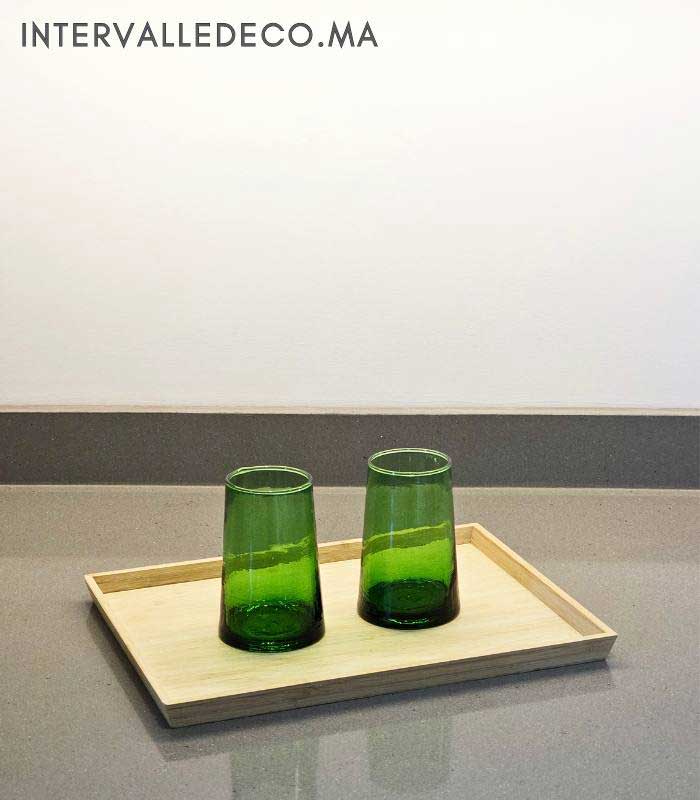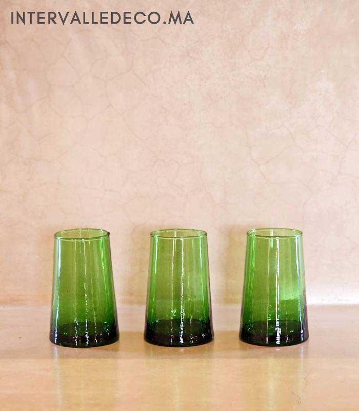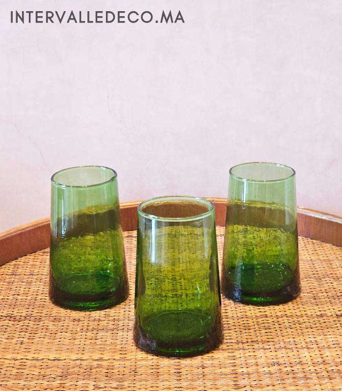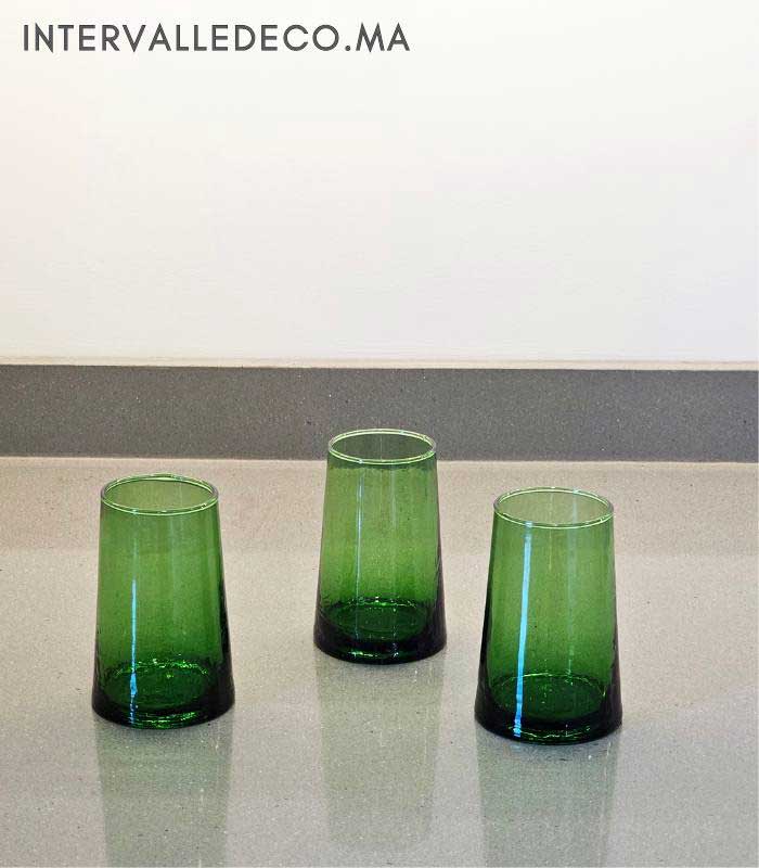 Le verre soufflé provient d’un savoir-faire artisanal toujours pratiqué dans les ateliers marocains. Chaque pièce est réalisée à la main, ce qui explique les légères variations visibles entre les verres.